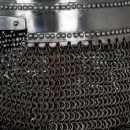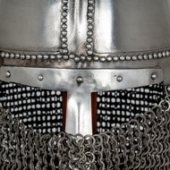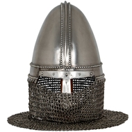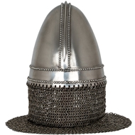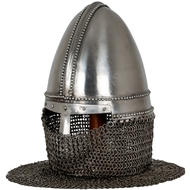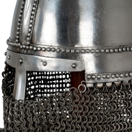 Spangenhelm Helmet with Wooden Stand - This is a Replica Spangenhelm Helmet with a chainmail aventail, a medieval-style helmet commonly used between the 6th and 11th centuries.